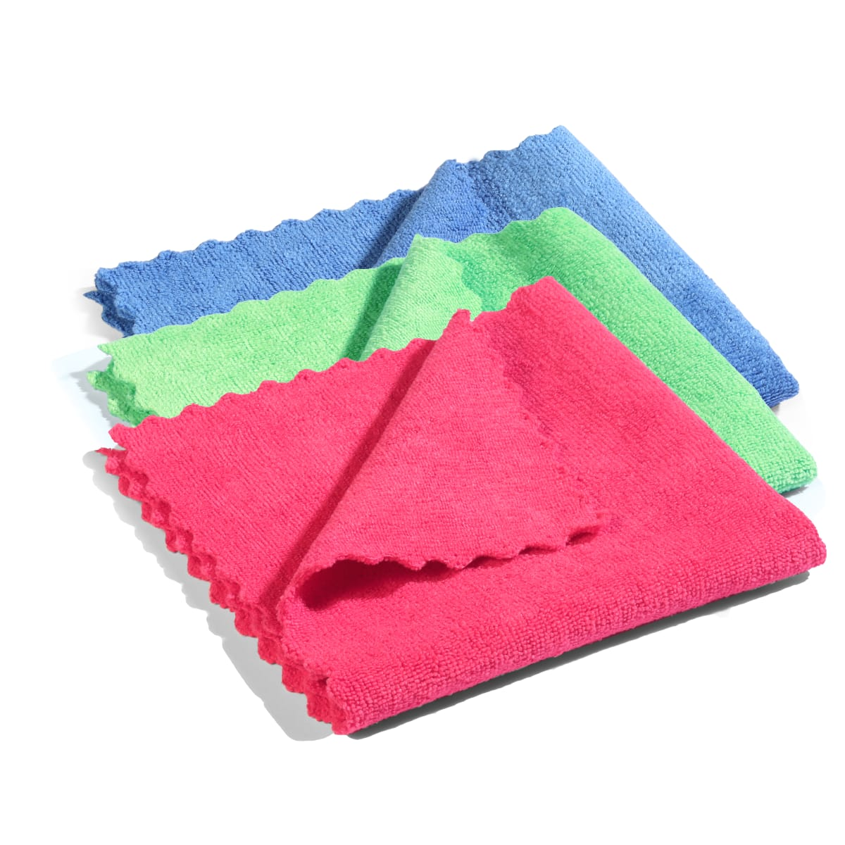 Unsere Mikrofasertücher in Blau, Grün und Rot sind farblich auf die passenden probiotischen Reiniger abgestimmt:
